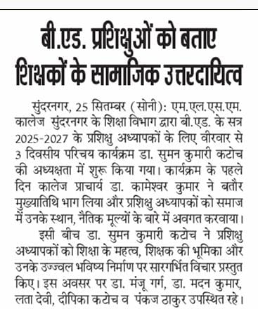 On May 26, 2025, the Department of Education at MLSM College, Sundernagar, bid a heartfelt farewell to the outgoing batch of 2023-25. Students from both sessions (2023-25 and 2024-26) came together, showcasing their talents through vibrant cultural performances, including the traditional Mandyali Dham.